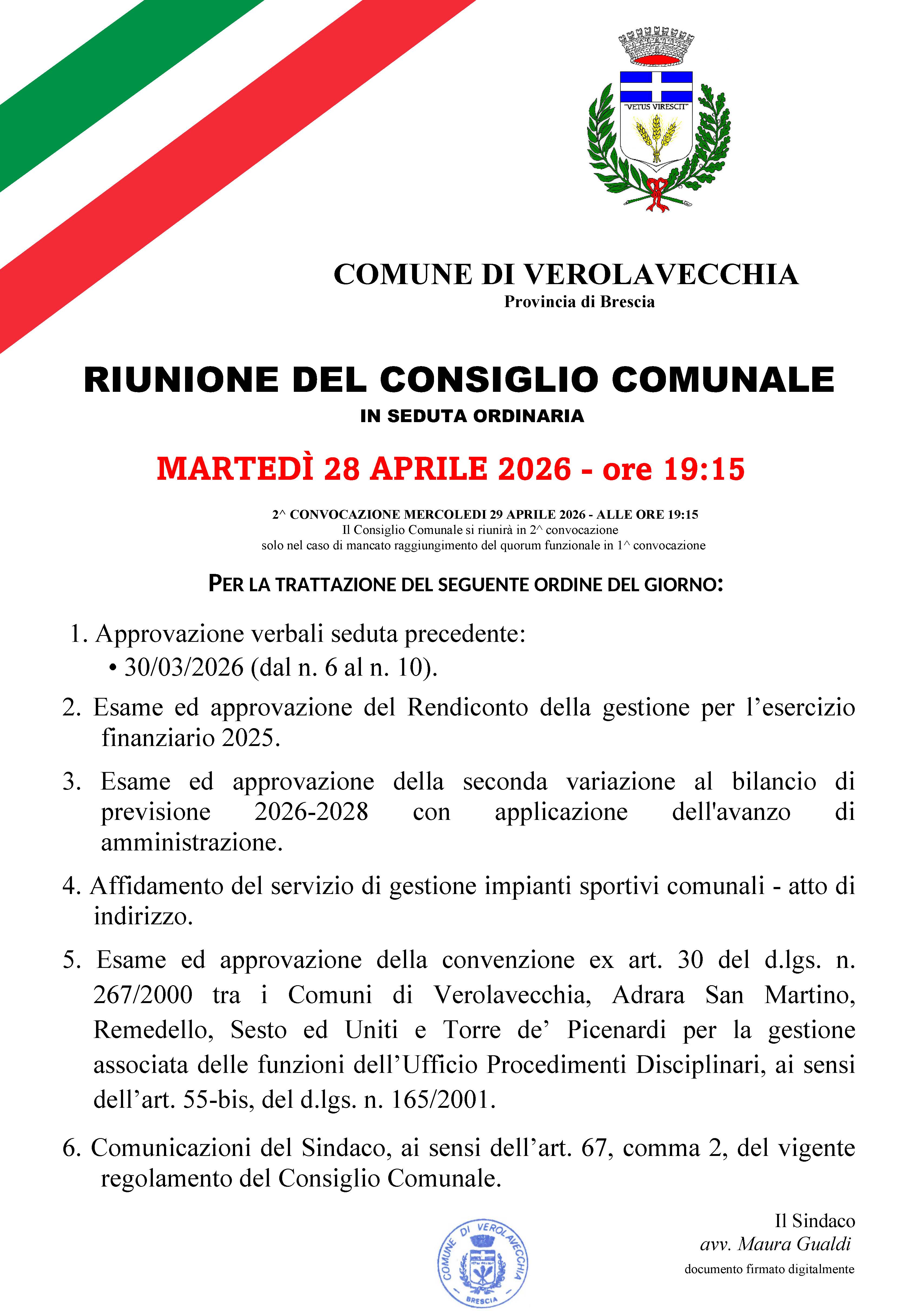 Il giorno 28 aprile 2026 - alle ore 19:15 - si terrà la seduta ordinaria del Consiglio Comunale per la trattazione degli argomenti indicati nell'allegato manifesto.